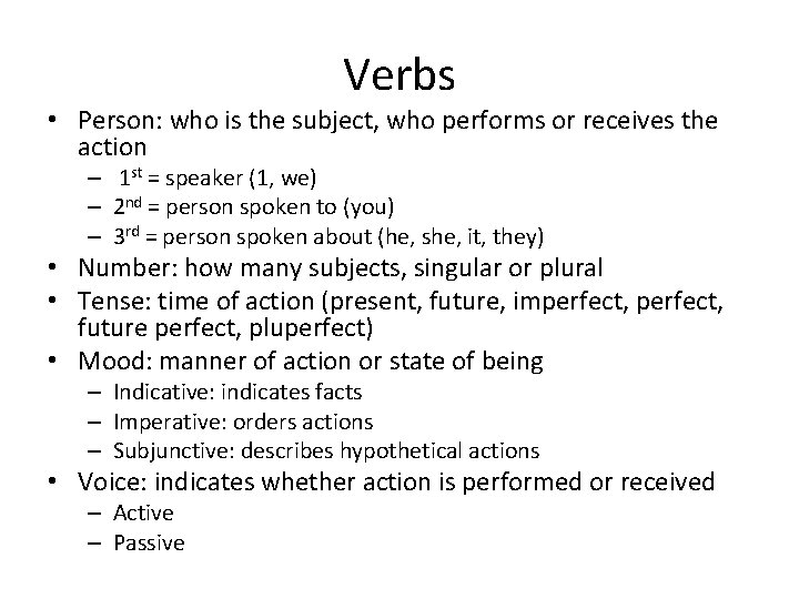 Verbs • Person: who is the subject, who performs or receives the action – 1 st = speaker (1, we) – 2 nd = person spoken to (you) – 3 rd = person spoken about (he, she, it, they) • Number: how many subjects, singular or plural • Tense: time of action (present, future, imperfect, future perfect, pluperfect) • Mood: manner of action or state of being – Indicative: indicates facts – Imperative: orders actions – Subjunctive: describes hypothetical actions • Voice: indicates whether action is performed or received – Active – Passive