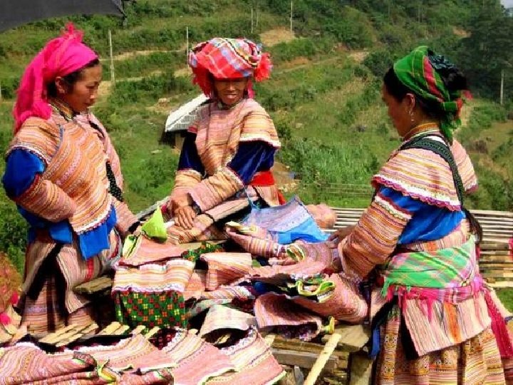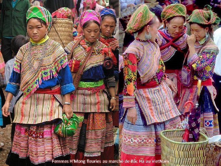 Au Vietnam, vous croiserez aussi les Hmong dans la province de Lau Cai, sur les marchés de Sapa, Bac Ha, Can Cau. . . Ici, on ne vient pas que troquer : les jeunes gens, parés de leurs plus beaux costumes, viennent aussi cher l'âme soeur. Cette région, plus facilement accessible que celle de Ha Giang car desservie par le train, est plus fréquentée par les touristes. Sur la photo suivante, des Hmong "fleur" vendent leurs tissus.
