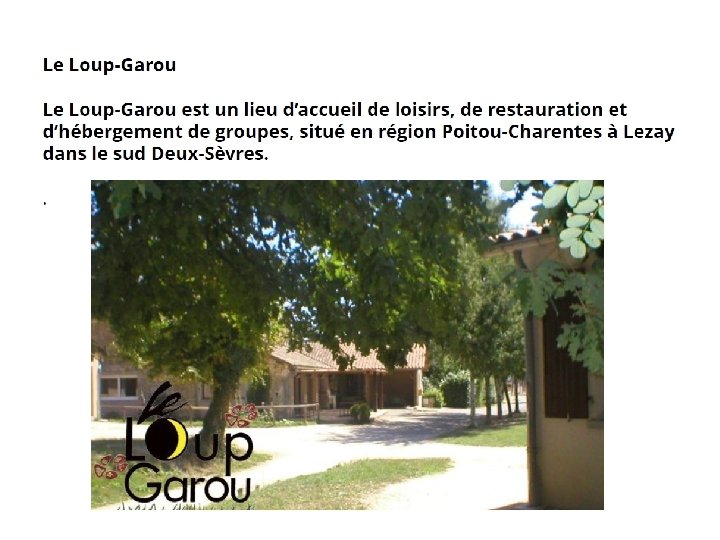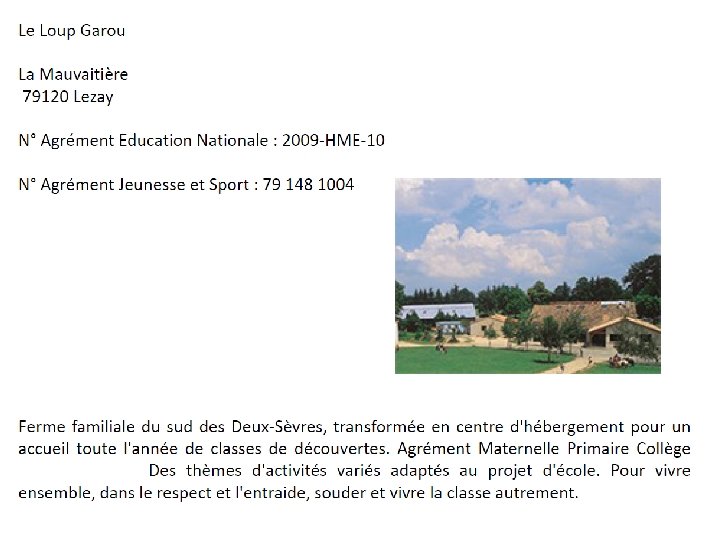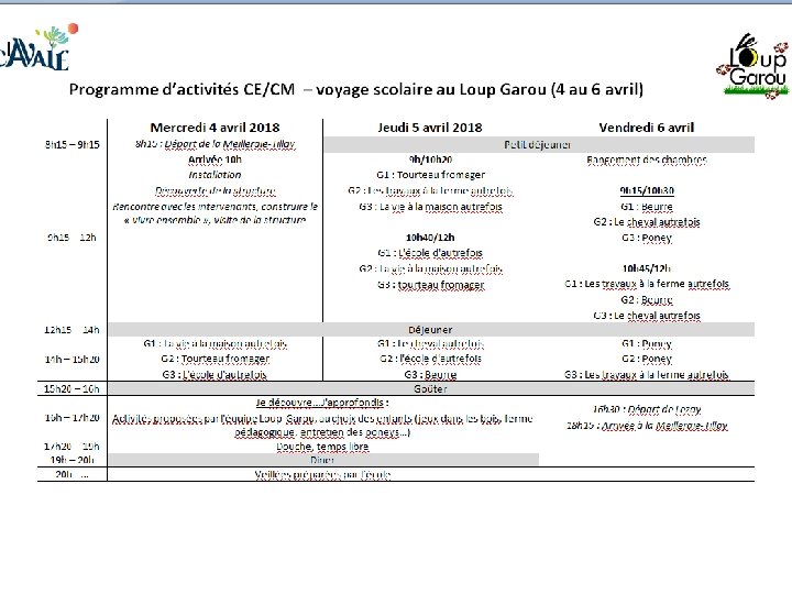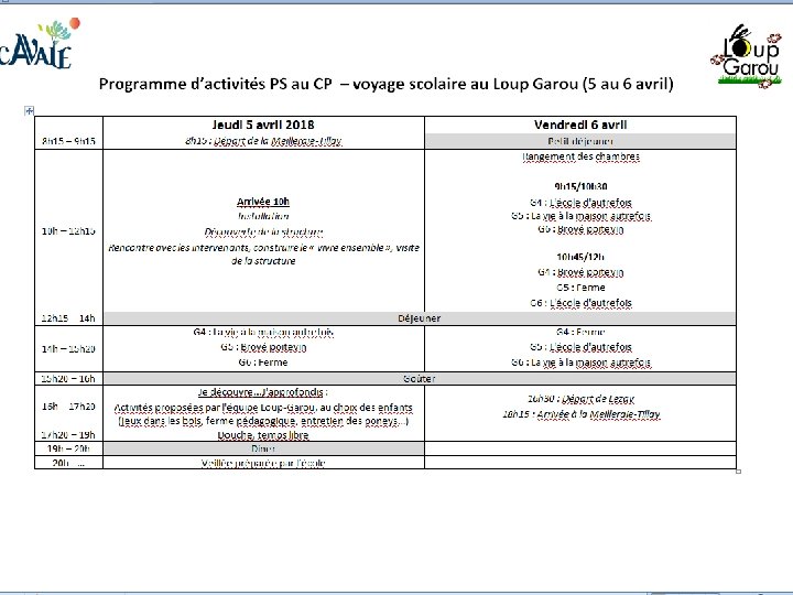 VOYAGE SCOLAIRE AU LOUP GAROU, À LEZAY PS à CP : jeudi 5 à vendredi 6 avril CE et CM : mercredi 4 à vendredi 6 avril