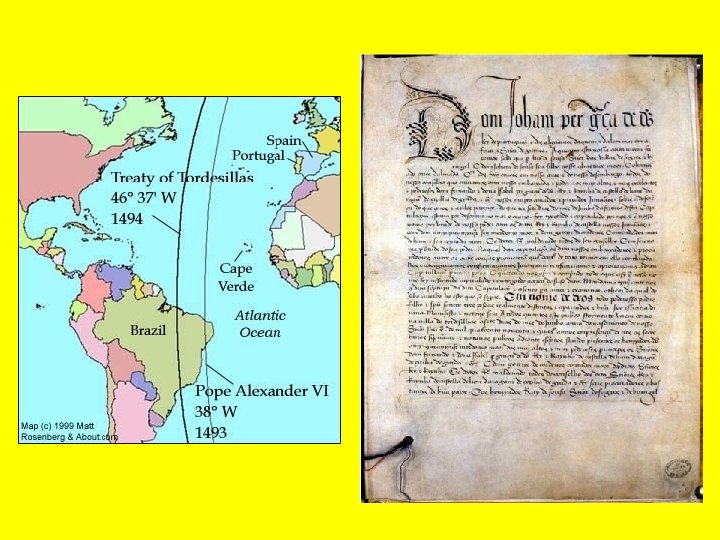 Treaty of Tordesillas • Pope Alexander VI drew a line of demarcation dividing the new lands between Spain and Portugal. • Portugal protested so the line was moved farther west and the treaty was signed. • Spain was to control all the lands west of the line. • Portugal was to control all the lands east of the line.