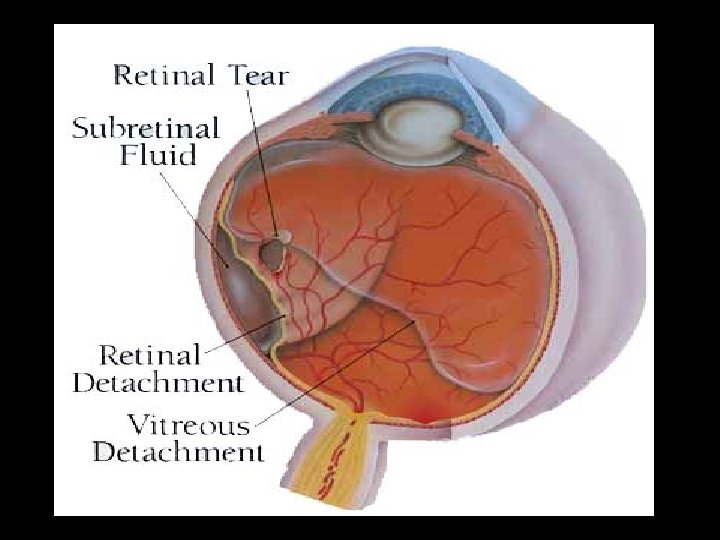 Definitions u RRD: RD secondary to a retinal break u NRD: RD without a retinal break u Exudative RD: RD where the detachment is secondary to fluid that leaks from the vessels of the retina/ choroid u Tractional RD: RD due to retinal fibrosis and traction