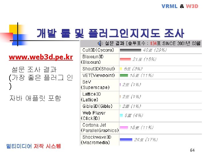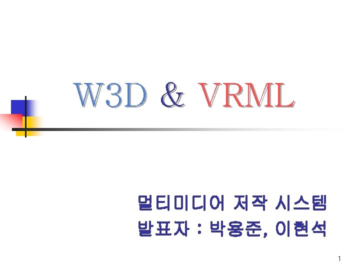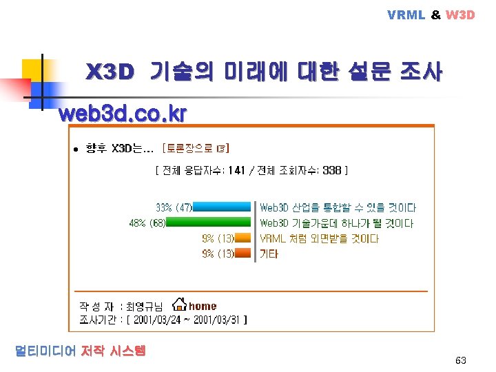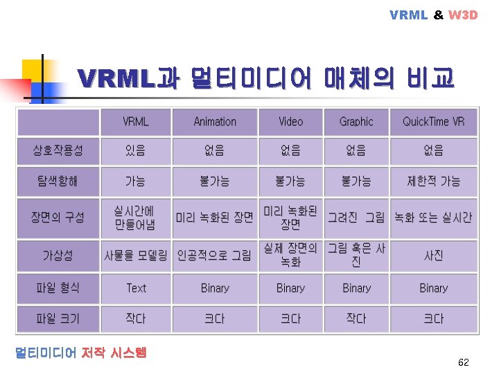 VRML & W 3 D VRML 의 활용 (4/4) n 오락. 이벤트 n n 악어 먹이사냥 게임 http: //www. atom. co. jp/vrml 2/walk/sala. wrl 디노 사우르스 만화 http: //www. kahunanui. com/dinos/index. html Floop 이라는 만화 http: //vrml. sgi. com/floops/ 사이버 쇼핑몰 n n VRML 2. 0과 Java, VRMLScript를 이용한 구현된 사이버 쇼핑몰 http: //vrml. imige. co. kr/VRML/ http: //www. kobo. net/ 멀티미디어 저작 시스템 61