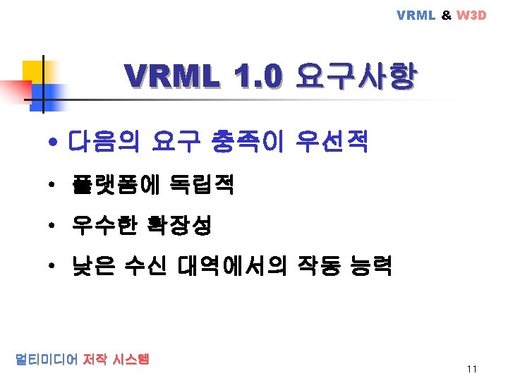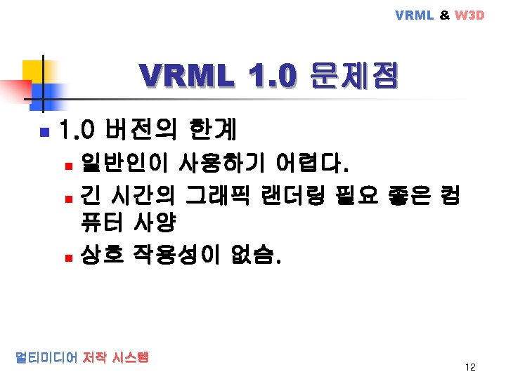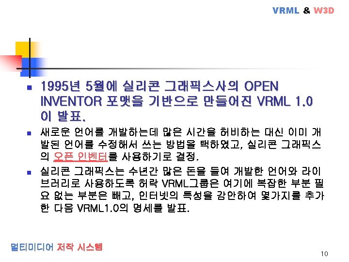 VRML & W 3 D VRML Translator(2/2) n n VRML 1. 0을 2. 0파일로 변환 Vrml 1 to 2 n n Vrml 1 to. Vrml 2 Converter n n 제작: Sony Corporation 지원 플랫폼: SGI, Sun, 윈도 95, 윈도 NT URL: http: //vs. sony. co. jp/index-e. htm 제작: Silicon Graphics Computer Systems 지원 플랫폼: SGI URL: http: //vrml. sgi. com/developer/index. html VRML 압축 - Win GZ (Win gzip) 멀티미디어 저작 시스템 50