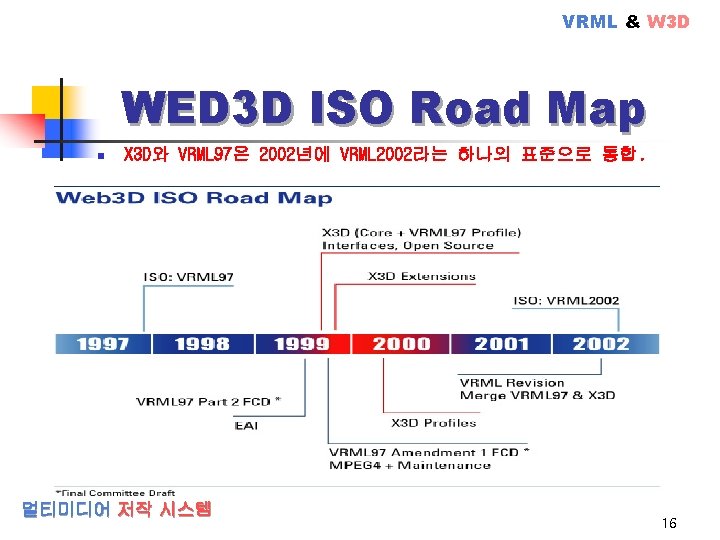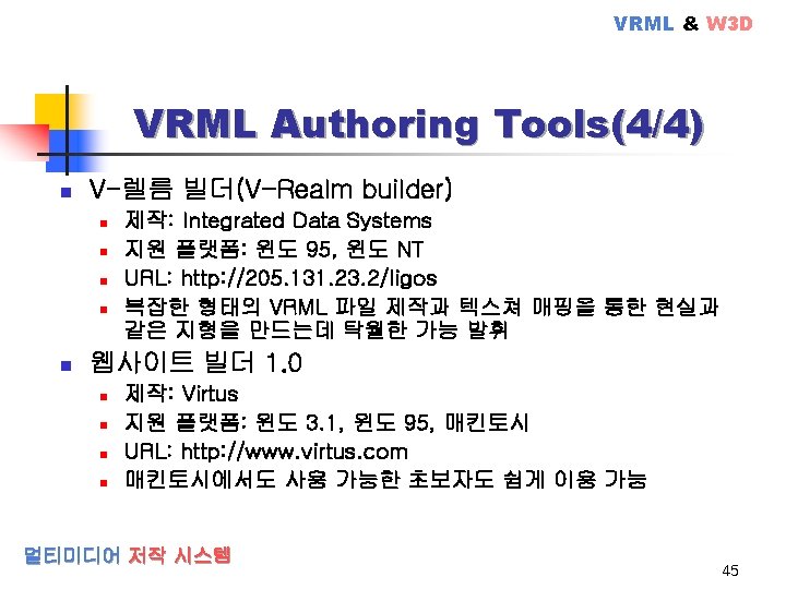 VRML & W 3 D VRML Browsers (3/3) n World View n n n Intervista사가 제작하여 현재 2. 0 버전. Direct 3 D를 포함하는 Direct. X 렌더링 지원. Java와 Java. Script를 script 언어로 사용. Platforms: Macintosh, Windows 95 and Windows NT 기타 n n n Netscape사의 Live 3 D, Liquid Reality (Microsoft) Net. Animator (Geometric Software Services Co. Ltd, India) Real. Space Viewer (Live Picture) Torch (New. Fire) Vrwave (IICM, Graz University of Technology, Austria) 멀티미디어 저작 시스템 56