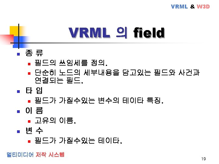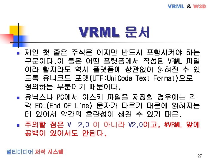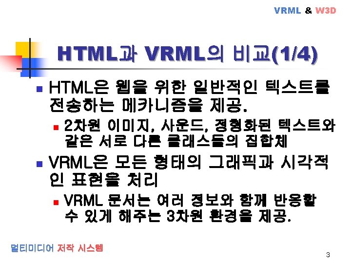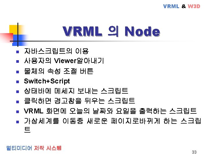 VRML & W 3 D VRML 의 Node n 환경이나 효과에 관련된것들 n DEF & USE n Inline - 외부파일의 이용 Background Viewpoint - 카메라의 설치 Navigation. Inf Spot. Ligh Soun n n 멀티미디어 저작 시스템 n n n Image. Textur Movie. Textur Pixel. Textur Billboar Collisio Fo 32