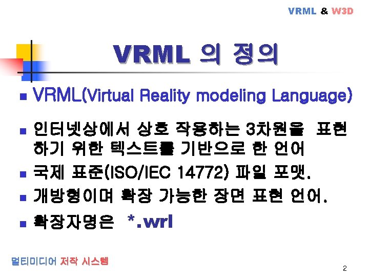 VRML & W 3 D VRML Translator(1/2) n n 미리 다른 형태로 제작된 기하 모델을 VRML 파일로 변 환시켜주는 도구 3 D Studio 2 vrml plugin n n 제작: Kinetix 지원 플랫폼: 윈도 NT URL: http: //www. ktx. com Auto. Desk 3 D studio의 파일을 VRML 2. 0으로 변환시켜 준다. Nu. Graf n n n 제작: Okino Computer Graphics, Inc 지원 플랫폼: 윈도 95, 윈도 NT 변환 가능한 형식: Alias polyset, Antic CAD-3 D, Auto. Desk 3 D studio, Auto. Desk Auto. CAD, IGES, New. Tek Light. Ware, POV-Ray, Pixar Renderman, USGS, Wavefront 멀티미디어 저작 시스템 49