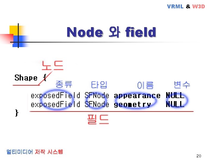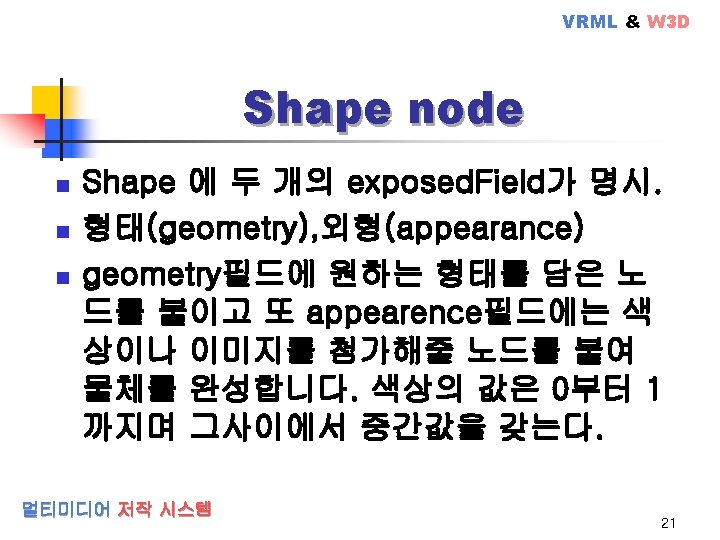 VRML & W 3 D Shape node #VRML V 2. 0 utf 8 Shape { geometry Box { size 3 3 3 } appearance Appearance { material Material { diffuse. Color 1 1 0 } } } 멀티미디어 저작 시스템 22