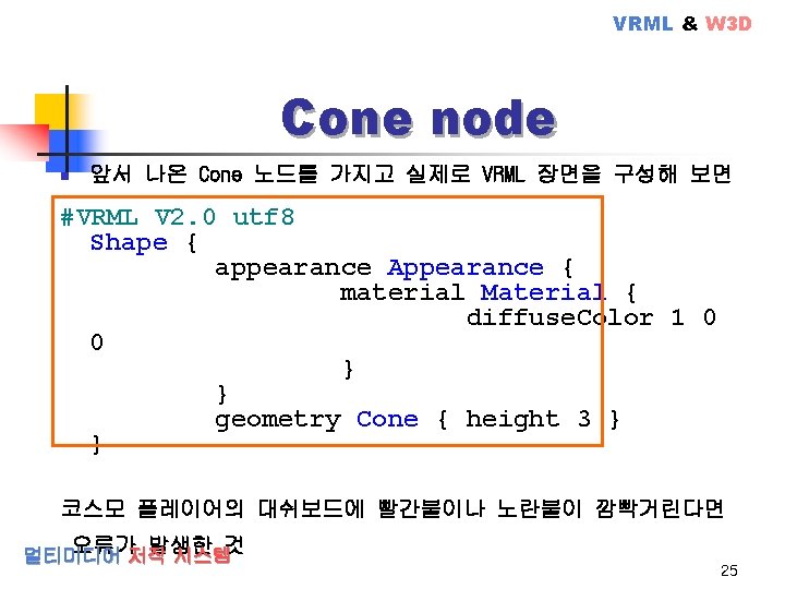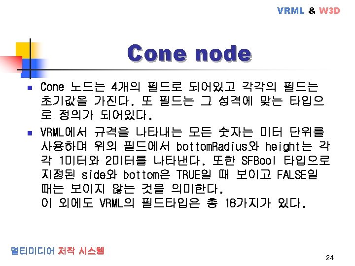 VRML & W 3 D Cone node 간단히 Cone 노드에 대해 살펴보면, n Cone { field SFFloat bottom. Radius 1 field SFFloat height 2 field SFBool side TRUE field SFBool bottom 멀티미디어 저작 시스템 n 23