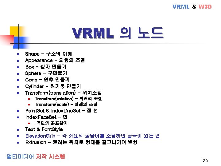 VRML & W 3 D Html에 삽입하기 n 페이지내 삽입 <html><body> <embed src="***. wrl" width="320" height="280"> </body></html> n 페이지전체로 열기 n n <a href="***. wrl>VRML보기</a> 조정대 없에기 n n 구경하는 사람은 정해준 시점만 볼 수 있다. <EMBED SRC="***. wrl" WIDTH=120 HEIGHT=90 VRML -DASHBOARD=FALSE> 멀티미디어 저작 시스템 28