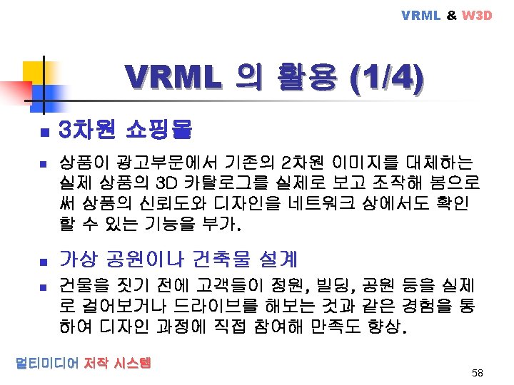VRML & W 3 D VRML 의 활용 (2/4) n n n 가상 홈 쇼핑 및 전시회 (Virtual omeshopping & Exhibition) 아트 갤러리/박람회 (Virtual Art Gallery) 오락 이벤트 (Virtual Event) 안내 시스템 (Information System) 교육분야 (Education) 기업 홍보 홈페이지 (Internet Homepage) 멀티미디어 저작 시스템 59