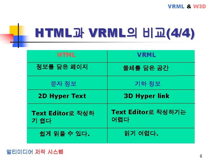 VRML & W 3 D VRML 의 활용 (3/4) n n n 가상 모델 하우스 가상 오피스 전시 (미국) http: //members. aol. com/hytritium 2/new 4 d. wrl 가상 주택 전시관 http: //www. serendib. com/geo/museumgz. wrl 주문형 모델하우스 http: //www. infinite-d. com/houses/house. html 가상 아파트 전시 http: //www. cybertown. com/vrml 20/apta. html 멀티미디어 저작 시스템 60