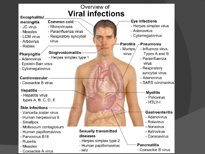 VÍRUS � Período de incubação � Compreendido pelo período entre infecção e aparecimento dos primeiros sintomas � Muito variável - dias até anos � Vírus que ocasionam lesões locais - 3 -10 dias (resfriado, diarreias) � Vírus que provocam exantemas - 10 -20 dias (rubéola) � Vírus com disseminação neural - Mais de 20 dias (raiva) � Extremamente variável - anos (HIV, HTLV)