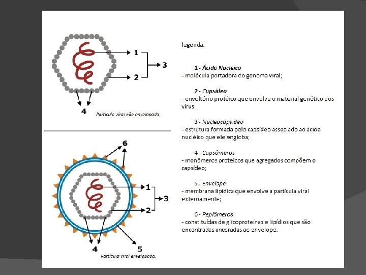 Componentes virais Os vírus são formados por um agregado de moléculas, formando uma estrutura denominada partícula viral. Uma partícula viral completa é denominada virion. Este é constituído por diversos componentes estruturais: � � � Ácido nucleico: molécula de DNA ou RNA que constitui o genoma viral. Capsômeros: subunidades proteicas (monômeros), que agregadas constituem o capsídeo. Capsídeo: envoltório proteico que envolve o material genético dos vírus. Nucleocapsídeo: estrutura formada pelo capsídeo associado ao ácido nucleico. Envelope: membrana rica em lipídios que envolve a partícula viral externamente. Deriva de estruturas das células hospedeiras, como membrana plasmática. Peplômeros (espículas): estruturas proeminentes, geralmente constituídas de glicoproteínas e lipídios, que são encontradas ancoradas ao envelope, expostas na superfície viral.