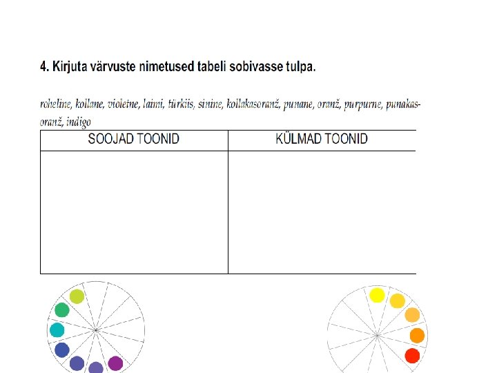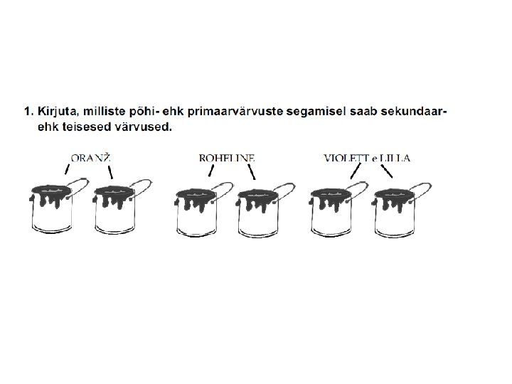 Värviõpetuse kordamistabel 1. Esimese astme värvid ehk PÕHIVÄRVID primaarvärvid Need on värvid, mille segamisel saadakse kõik ülejäänud värvid. Punane, kollane, sinine 2. Teise astme värvid sekundaarvärvid Esimese astme seguvärvid. Saadakse põhivärvide omavaheliselt segamisel. Oranz, Roheline, violetne 3. Kolmanda astme värvid tertsiaarvärvid Teise astme seguvärvid. Neid värve saame, kui segame teise astme värve omavahel või põhivärvidega. Punakaspruun, kollakaspruun, sinakaspruun, laimi, purpur, türkiis, indigo jne.