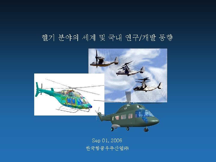 헬리콥터의 개발 현황 1 st stage: during WWII : Sikorsky R-4, -5, -6 2 nd stage : turboshaft engines introduced in 1957 weight - 0. 3 lb/hp , compared to reciprocating engines 1 lb/hp during 1960 s and Viet Nam conflict : AH-1, UH-1, CH-46, 47, 53 recognized as military missions 3 rd stage : during 1970 s technical advances in rotor and engine technologies weapon systems integration improved UH-60, AH-64 advanced airfoils, planforms (swept) 4 th stage : during 1990 s EH 101, NH-90, MD 900, RAH-66, V-22, Bell 430, mission systems designed into the aircraft as opposed to an add-on architecture, advanced electronics, composite materials, FBW technology, advanced engines, reduced costs and maintainability Korea Aerospace Industries Proprietary Information
