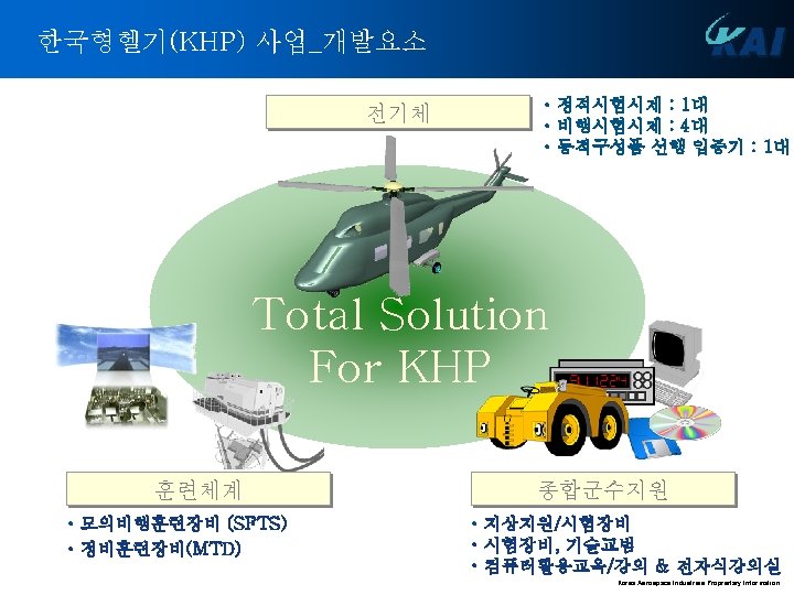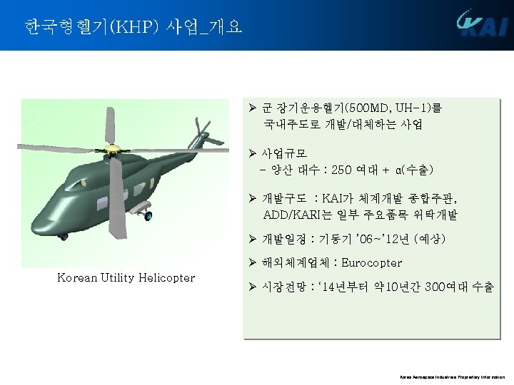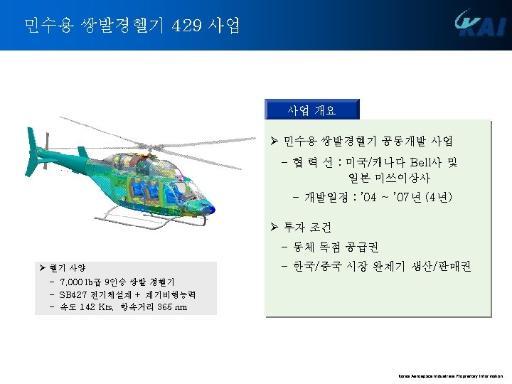 헬리콥터 업체의 변화 Mc. Donnel Lockheed Sikorsky Kaman Doman Piasecki Vertol Boeing Bell Hughs Hiller Fairchild Brantly Ryan 1940 / 1950 1960 Today Complex arrangements of contractual alignments Boeing Sikorsky Bell Kaman Robinson Schweizer Bristol Westland Fairey Saunders Roew Weir/Cierva/ Anster Westland Agusta Sud Oest Sud Est Aerospatiale VFW Dornier Bolkow/MBB Wagner MBB GKN-Westald/Agusta Eurocopter France Eurocopter Deutschland Korea Aerospace Industries Proprietary Information