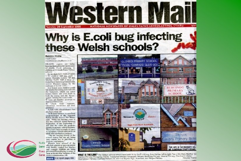 Outbreaks of VTEC O 157: Wales: 1990 -2005 1990 1991 1993 1995 1997 1999 2000 2005 Psychogeriatric ward 4 cases Day nursery 9 cases Butcher’s shop 8 cases Day nursery 49 cases EMI home 3 cases Open farm 24 cases Campsite 2 cases Prison 8 cases School meals 118 (157) cases Infants’ School 15 cases School & nursery 10 cases