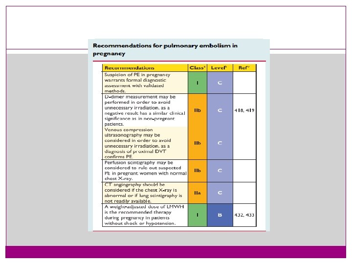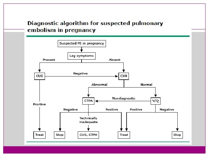 Echocardiography � NOT routinely performed in the diagnostic evaluation of a pregnant patient suspected of having a PE. � excludes CMP or to evaluate the size of the RV in a patient with confirmed PE. �However, the prognostic value of RV dilation by echocardiogram has not been formally evaluated in pregnancy.