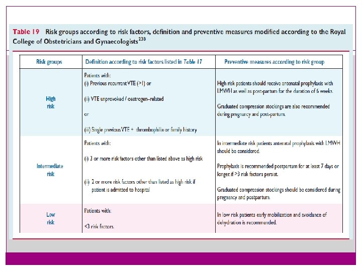 �On the basis of the type and the total number of risk factors present in the individual patient, three risk groups can be identified (high, intermediate, and low risk groups) and preventive measures applied accordingly. �Previous recurrent VTEs and previous VTE— unprovoked or estrogen related—are considered high risk factors. �The exact influence of the other single risk factors or the summation of several risk factors on total VTE risk is not known according to ROYAL college.