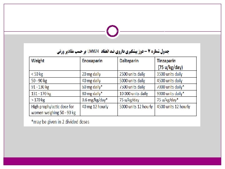 prophylaxis � LMWH has become the drug of choice for the prophylaxis and treatment of VTE in pregnant patients. It causes less bone loss than UFH, and the osteoporotic fracture rate is lower (0. 04% of pregnant women treated with LMWH). � The dose of LMWH for thrombo prophylaxis is based on the booking weight. There are no data to guide appropriate doses of LMWH for pregnant women who are obese or puerperal. � It is agreed that women of higher weights should receive higher doses, but there are no studies available on the optimal dose and weight ranges. � Patients at high risk for VTE should receive the usual prophylactic dose of 0. 5 IU /kg body weight of enoxaparin or 50 IU/kg body weight dalteparin twice daily.