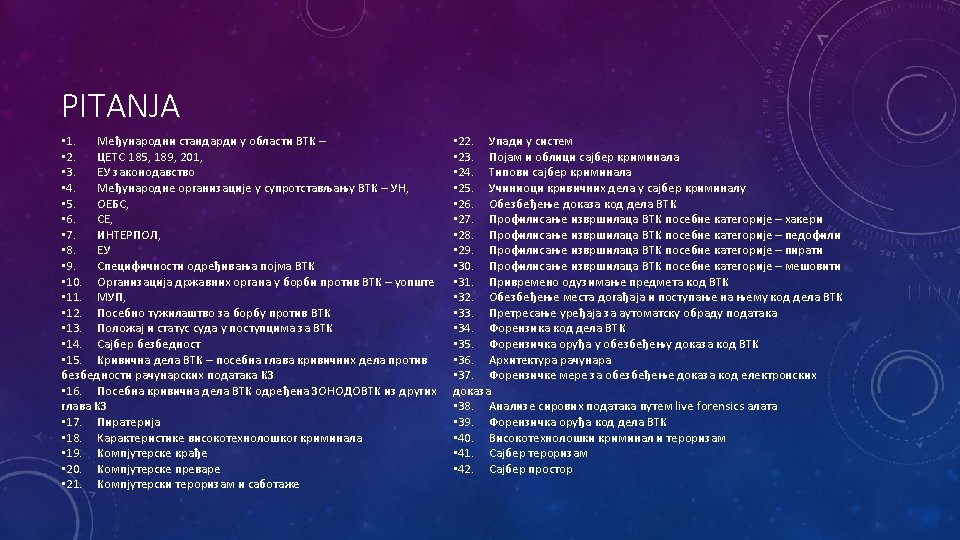 RASVETLJAVANJE • Uloga policije u predistražnom postupku je preovlađujuća iako je rukovodilac JT • Obezbeđenje lica mesta - Uputstvo o postupanju sa digitalnim dokazima • Uviđaj ili pretresanje? • Prikupljanje obaveštenja od pravnih lica i komunikacija sa ISP i kablovskim i telekomunikacionim kompanijama • Pretresanje stana i drugih prostorija i lica, a posebno pretresanje računara • Privremeno oduzimanje predmeta • Korišćenje uređaja za javni nadzor, privatnih bezbednosnih uređaja • Korišćenje naloga SPP za listinge, dovijanje JT sa računarskim pretraživanjem ličnih podataka, • PDR • Saslušanje osumnjičenog i okrivljenog • Ispitivanje svedoka