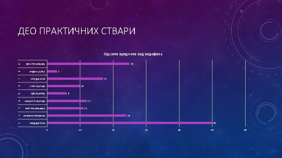 OSTALI UREĐAJI • Privremeno oduzimanje ostalih digitalnih uređaja na kojima se mogu pronaći elektronski dokazi razlikuje se u zavisnosti od toga da li je uređaj isključen ili uključen. • Policijski službenik ns treba da uključuje uređaj koji je isključen. Ukoliko je uređaj uključen, potrebno je fotografisati ekran uređaja i u službenoj belešci onisati sve što se nalazi na ekranu. RBA (Psrsonalpi digitalpi asistent) potrebno js ostaviti uključenim dok je ostale uređaje neophodio isključiti. • Digitalni uređaj zajedno sa svim pripadajućim kablovima i uređajima za skladištenje podatakaje potrebno staviti u antistatičku kesu. • O svim preduzetim radnjama u postupku privremenog oduznmanja digitalnih uređaja potrebno je sačiniti službenu belešku u koju će se uneti i lozinke dobijene od vlasnika uređaja.