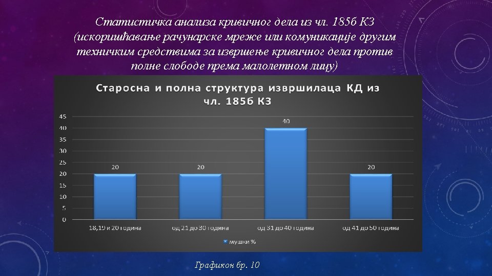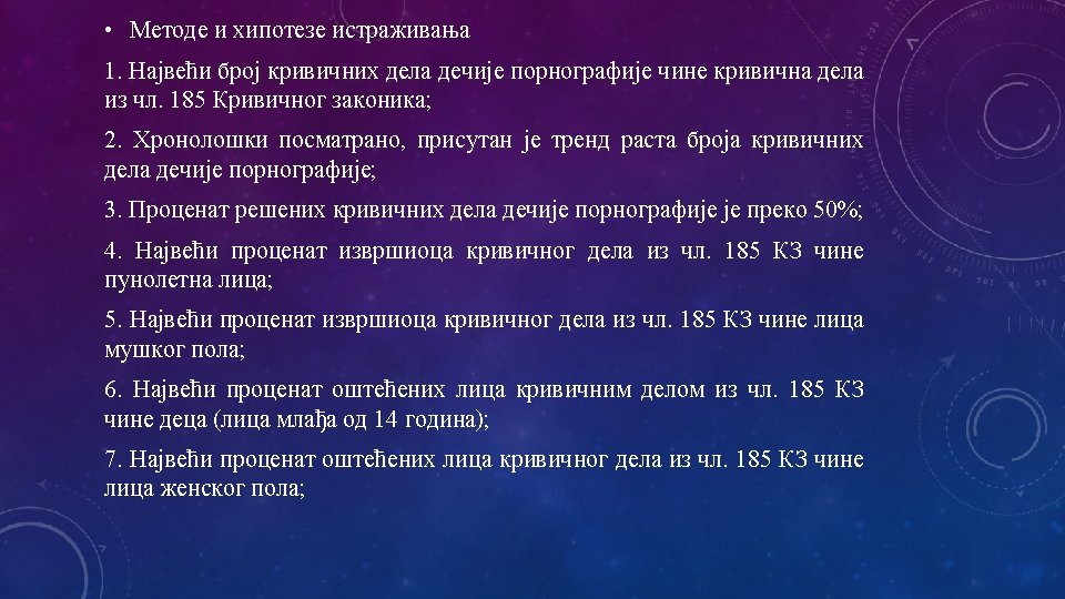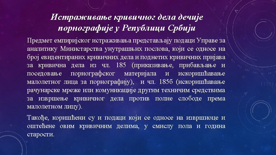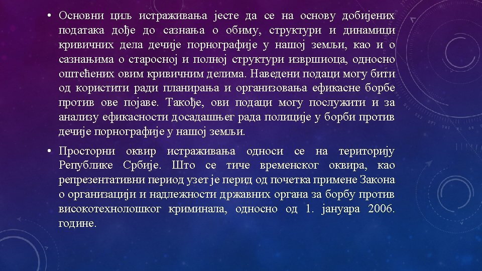 q CILJ ISTRAŽIVANJA q. Utvrđivanje socio-demografskih karakteristika izvršilaca krivičnog dela Prikazivanje pornografskog materijala i iskorišćavanje dece za pornografiju iz čl. 185. KZ, radi bližeg određenja nosilaca ove kriminalne aktivosti.