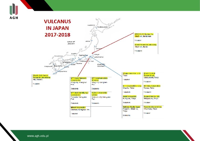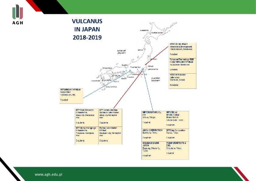 Z czego składa się program Vulcanus? • Tygodniowe seminarium dot. Japonii (wrzesień) • Czteromiesięczny intensywny kurs j. japońskiego (wrzesień-grudzień) • Ośmiomiesięczna praktyka zawodowa w jednej z japońskich firm (styczeń-sierpień) • W lipcu 1 dniowe spotkanie organizacyjne w Brukseli/ dojazd na koszt uczestnika • Wszyscy uczestnicy przyjeżdżają i opuszczają Japonię w jednym terminie określonym przez organizatora.