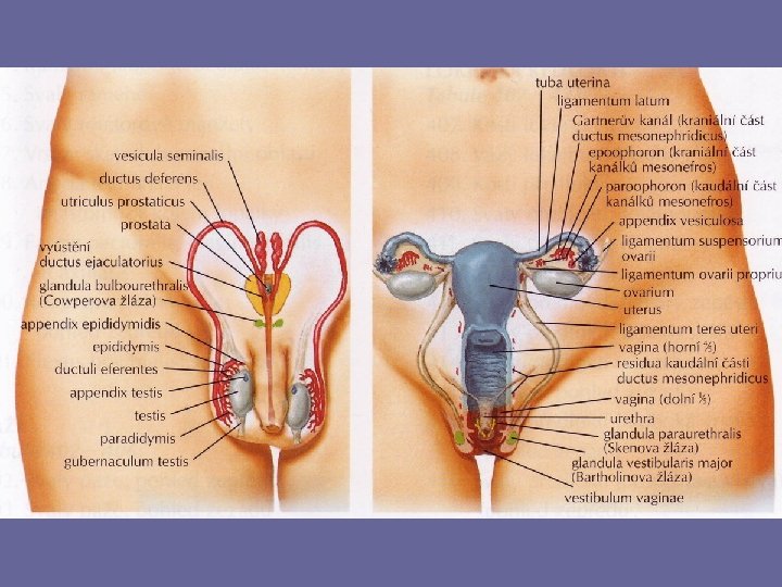 Ženské pohlavní ústrojí ženské pohlavní žlázy (párový orgán)= vaječníky - uloženy v dutině břišní - produkují vajíčka: