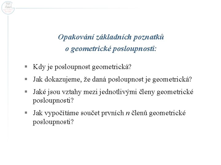 Opakování základních poznatků o geometrické posloupnosti: § Kdy je posloupnost geometrická? § Jak dokazujeme, že daná posloupnost je geometrická? § Jaké jsou vztahy mezi jednotlivými členy geometrické posloupnosti? § Jak vypočítáme součet prvních n členů geometrické posloupnosti?