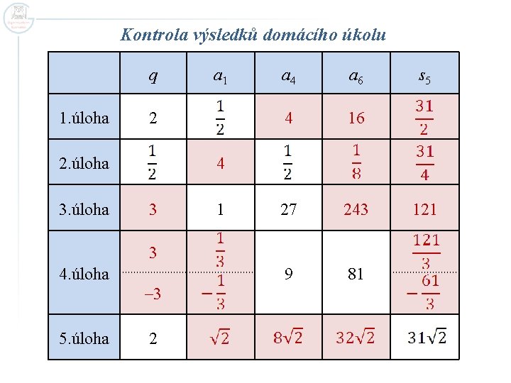 Kontrola výsledků domácího úkolu q 1. úloha 2 2. úloha 3. úloha a 1 a 4 a 6 4 16 27 243 9 81 4 3 1 3 4. úloha – 3 5. úloha s 5 2 121
