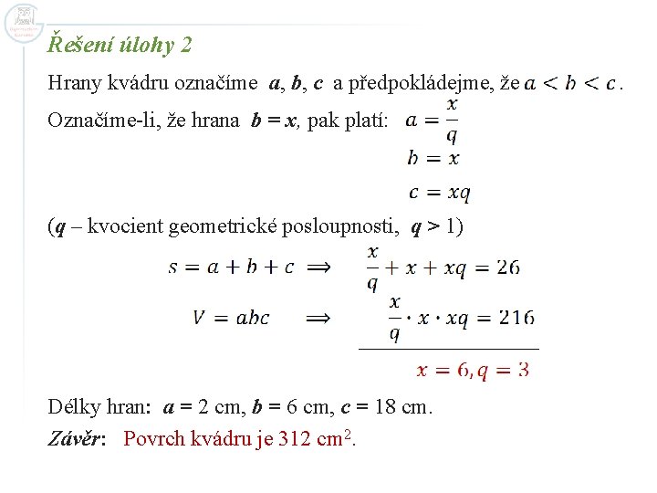 Úloha 2 Délky hran kvádru tvoří tři po sobě jdoucí členy geometrické posloupnosti. Jejich součet je 26 cm. Jak velký je jeho povrch, je-li objem kvádru 216 cm 3.