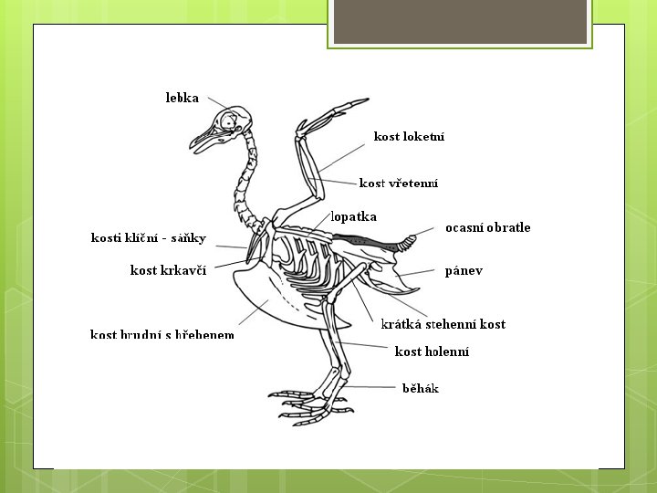 Ø kostra: Ø zobák – bezzubý Ø páteř s obratli Ø křídla Ø hrudník Ø žebra Ø hrudní kost s hřebenem Ø upínají se létací svaly Ø nohy => běhák s prsty (4)