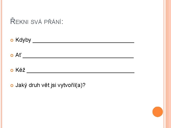 ŘEKNI SVÁ PŘÁNÍ: Kdyby tady bylo víc kamarádů! Ať je o Vánocích sníh! Kéž by vše dopadlo dobře. Jaký druh vět jsi vytvořil(a)? věty přací