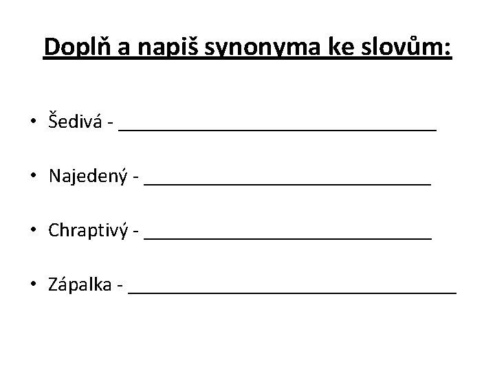 Doplň a napiš synonyma ke slovům: • Šedivá - sivá____________ • Najedený - sytý__________ • Chraptivý - sípavý_________ • Zápalka - sirka___________