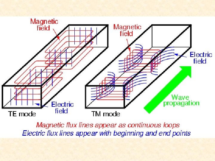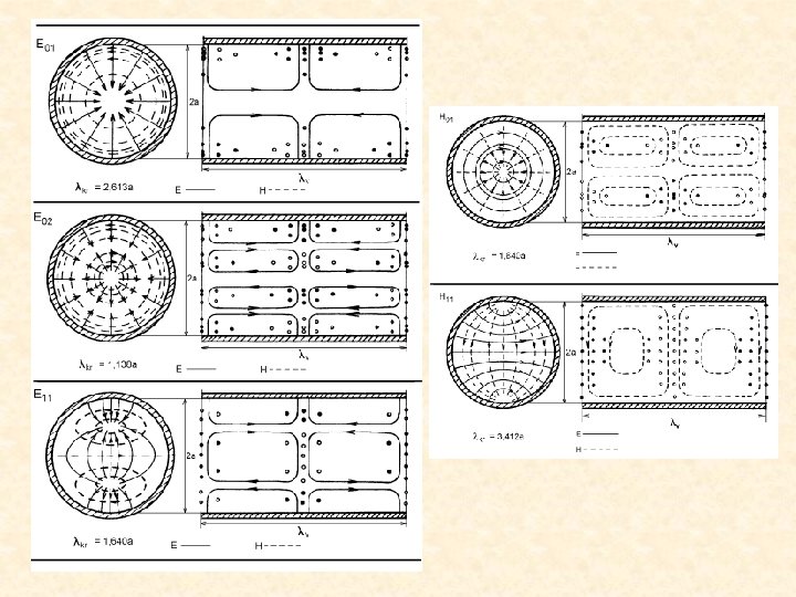 Typy vln ve vlnovodu Elektrické vlny (E-vlny) neboli transverzálně-magnetické vlny (TM-vlny) – Ez 0, Hz = 0 – podélná složka magnetického pole je nulová Magnetické vlny (H-vlny) neboli transverzálně-elektrické vlny (TE-vlny) – Hz 0, Ez = 0 – podélná složka elektrického pole je nulová Transverzálně elektromagnetické vlny (TEM vlny) – Ez = 0 i Hz = 0 – mohou se šířit pouze ve vybraných typech vlnovodů – dvou a vícevodičových vlnovodech