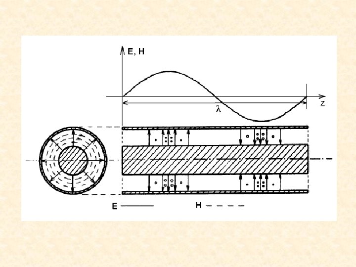 Koaxiální vedení – přenáší decimetrové vlny – výhodou je ohebnost, používá se na propojování – vnitřní a vnější vodič jsou odděleny dielektrickou vrstvou – vně není elmag. pole – nedá se ovlivnit vnějším polem – obecně je pásmo použitelnosti shora ohraničeno mezní frekvencí dominantního vlnovodového vidu TE 11, jehož šíření ve vlnovodu je nežádoucí – typická impedance je 50 a 75 – speciální typy koaxiálů přenáší i milimetrové vlny