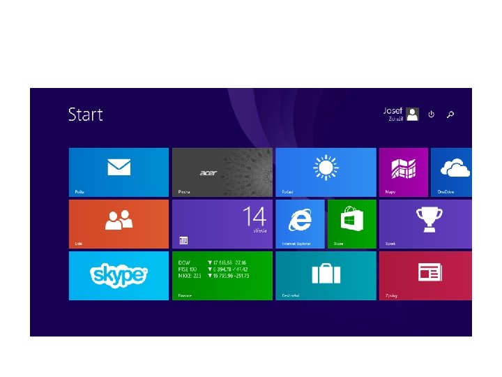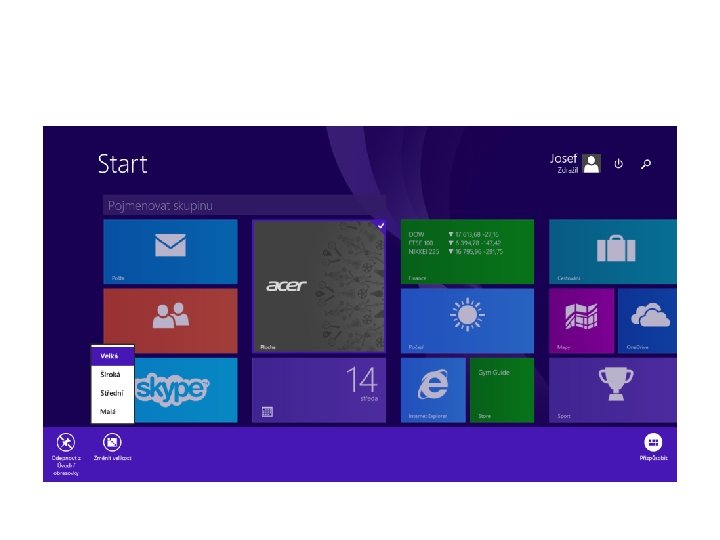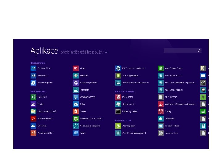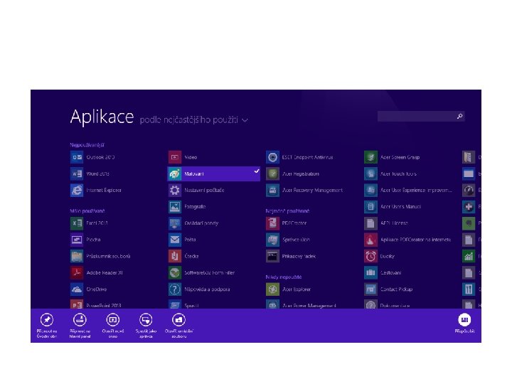 Základní orientace v operačním systému • • Obrazovka Start Zobrazení všech aplikací Připnutí často používaných aplikací Odepnutí aplikací z obrazovky Uspořádání obrazovky Start Další možnosti tlačítka Start Přizpůsobení zamykací obrazovky