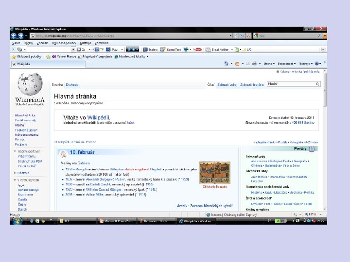 Wikipedia • Najznámejším príkladom wiki je on-line encyklopédia Wikipédia. Má uplatnenie aj v prostredí vzdelávania. Napr. študenti ju môžu použiť ako štartovací zdroj pri vyhľadávaní informácií o nejakej preberanej téme, ale tiež ich možno zapojiť do jej tvorby. • S Wikipédiou je potrebné pracovať obozretne. Niektoré odborné štúdie potvrdili jej relevantnosť a presnosť, ale Wikipédia je otvorená a tak pri je používaní musíme byť obozretní a nepoužívať ju ako jediný zdroj.