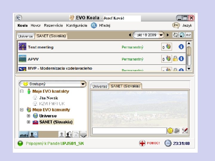 Videokonferenčný systém EVO • EVO - Enabling Virtual Organization • Systém EVO obsahuje bielu tabuľu a umožňuje zdieľanie plochy, nahrávanie a prehrávanie virtuálnych stretnutí. • Systém EVO je pre vzdelávacie účely voľne použiteľný. • Tvorí ho sieť serverov, ktoré sa nazývajú Panda a klientskych aplikácií nazývaných Koala.