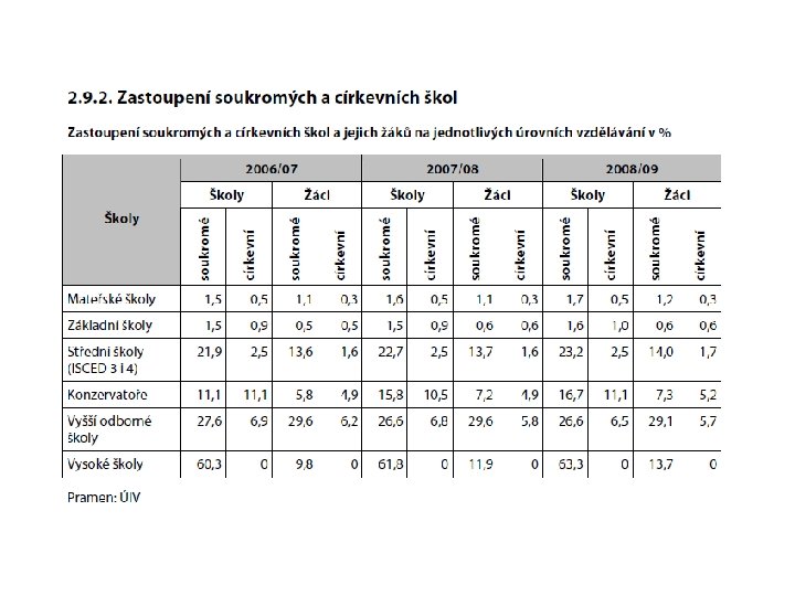 Financování vzdělávání • Financování na základě normativů • Bezplatné – u veřejných zřizovatelů (MŠ – předškolní rok, ZŠ, SŠ, VŠ), vyjma některých druhů poplatků • Převážně z veřejných zdrojů (soukromé výdaje cca 11 %) • Školné - soukromý sektor - neregulováno