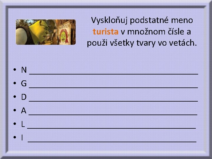 Výborne! Teraz si zopakujme ostatné gramatické kategórie podstatných mien. rod • • • od sluhov za radcom synovia k obchodníkovi o roľníkovi strýkovi ____ ____ číslo pád vzor ____ ____ ____ _______ _______