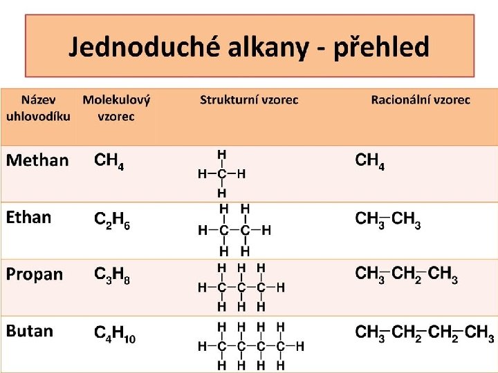 an § Jsou uhlovodíky s otevřeným řetězcem a jednoduchými vazbami mezi uhlíky § Názvy končí koncovkou § Skupenství: -an • Plynné uhlíky) • Kapalné • Pevné (1 až 4 (5 až 14) (15 a více)