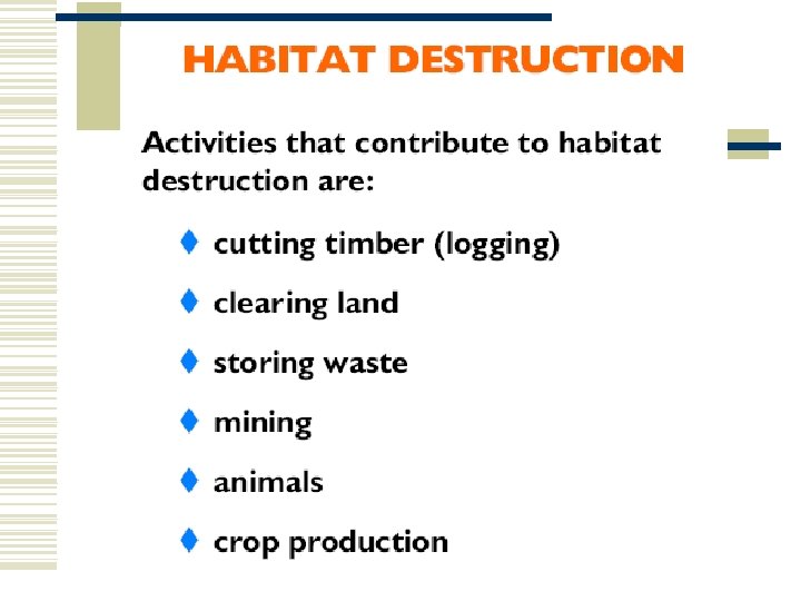 In what ways can habitat be destroyed? w Every day habitat is destroyed by many human activities. w Habitat is destroyed when timber is cut. A tree should be replaced for every tree that has been cut down. n Fortunately, the tree farms in the U. S. plant more trees than are cut every year. n