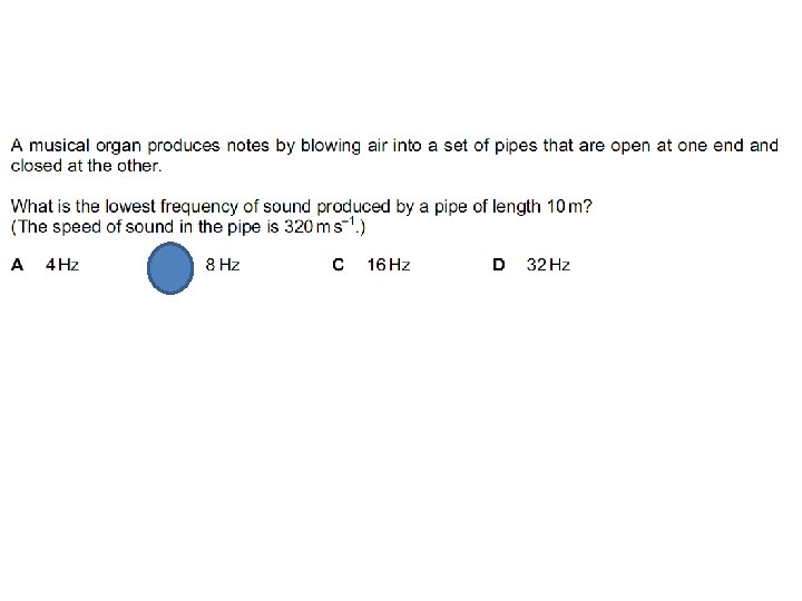 A pipe that is closed on one end has a seventh harmonic frequency of 466. 2 Hz. If the pipe is 1. 53 m long, what is the speed of the waves in the pipe? n=7 f 7 = 466. 2 Hz L = 1. 53 m L= 7/4 λ and λ = 4/7 L = 407. 6 m/s