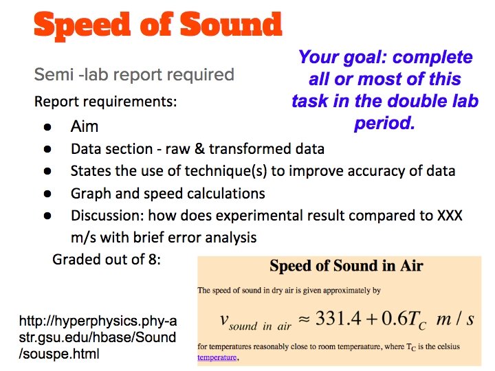 2018 class effort Tf-Ti= 0. 0149 s Tube length L = 2. 42 m V sound =325 m/s Main error in L value? Quick activity: in groups of 4, determine the speed of sound can you do better?
