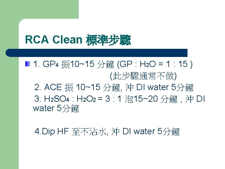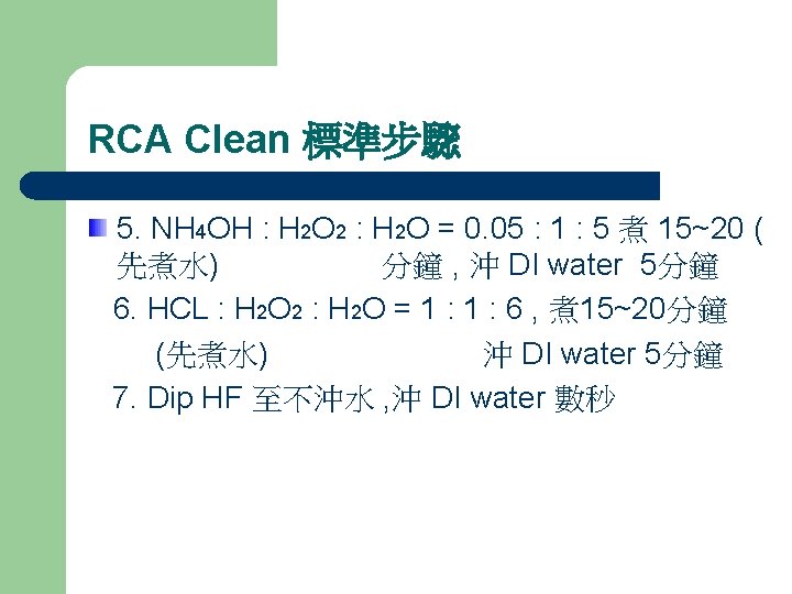 RCA and HF dip RCA Clean : (1)Removing the organic and metallic impurities from the silicon surface by oxidizing the silicon surface (2) Forming complexes with the contaminants, which become water-soluble. .