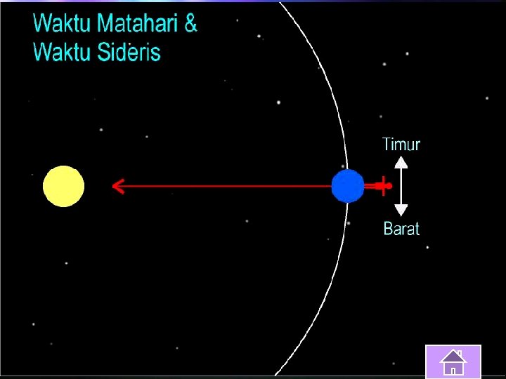 WAKTU SETEMPAT DAN WAKTU UMUM n n n Waktu adalah sistem pariodik lamanya pergerakan bumi terhadap acuan matahari atau bintang aries yang dianggap tetap. Waktu dengan acuan bintang Aries dinamakan waktu bintang atau sideris waktu yang mengacu pada matahari dinamakan waktu surya atau waktu matahari. Satu periode putar bumi sekeliling sumbunya terhadap acuan bintang Aries ditetapkan 1 hari bintang 1 hari surya ditetapkan lamanya satu periode putar bumi sekeliling sumbunya terhadap acuan matahari.