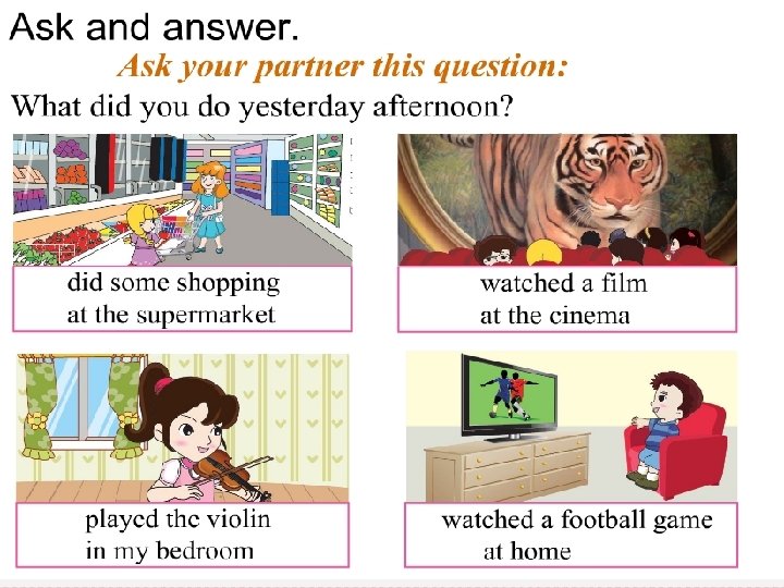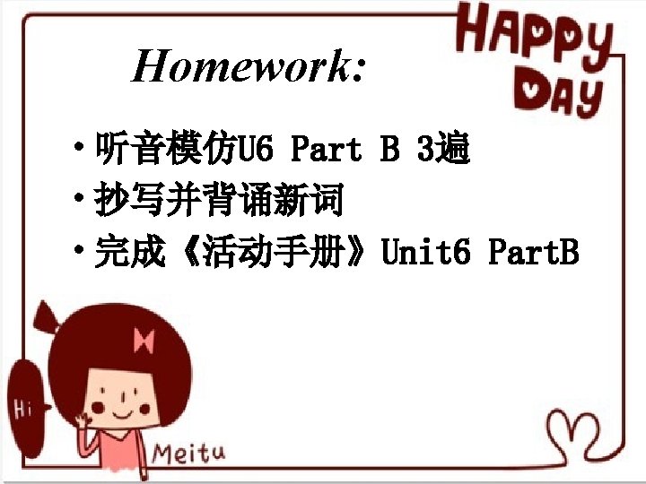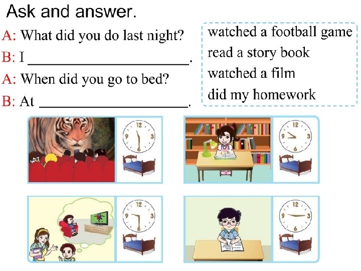 walk have lunch usually half late a taxi Slides: 26 Download presentation walk have lunch usually half late a taxi gotake to school get up past hour 动词原形 动词第三人称单数 过去时 gets got go goes went do does did takes took I say you act • • • get up have breakfast go to school get to school walk to school take a taxi 6: 30 12: 30 7: 30 8: 30 9: 30 00: 30 1: 30 At half past… Wang Tao got to school at eight o’clock. He was late. He came to his classroom. What happened next? May I come in? Come in, please. I’m sorry. I’m late. Go to your Seat. [si: t] Seat , seat, go to your seat. After class, what happened? • Why were you late today? 陈述句:You 疑问句: are late. Are you late ? 特殊疑问句:Why are you late ? 特殊疑问句(过去) • Why were you late today? • I got up late this morning. • When did you go to bed last night? • At half past eleven. past late 晚于 上一个 晚的 last night 上周日 [lɑ: st] last Sunday 昨晚 上个月 去年 last month last year Why did you go to bed so late? 这么晚 I watched a football game on TV. Oh. You’reso a little big football fan. 这么大 这么矮 这么多 so short so many/much little [‘lɪtl] 小的 fan 迷;粉丝;风扇 [fæn] My father is a football fan. 我爸爸是一个足球迷。 我弟弟是一个篮球迷。 My brother is a basketball fan. What did you do last night? I watch … ed a football game. When did you go to bed? What did you do last night? I read … a story book. When did you go to bed? What did you do last night? I watch … ed a film. When did you go to bed? What did you do last night? I did … do my homework. When did you go to bed? 过去时间词: yesterday 昨天 this 这个 morning/afternoon… last night…昨晚 today 今天 in the past 在过去
