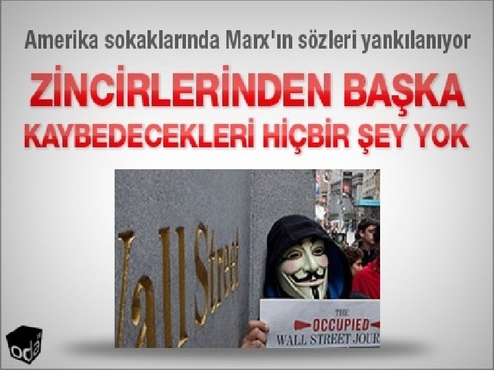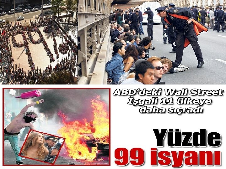 OCCUPY WALL STREET (WALL STREET'I IŞGAL ET) Arap Bahar’ı ile başlayan ayaklanma hareketleri önce Avrupa ve Amerika Birleşik Devletleri (ABD)’ne oradan da tüm dünyaya kadar ulaşmayı başardı. Hepimiz, buna tüm insanlık da diyebiliriz, tarihin bir kırılma anına, tarihin büyük bir dönüm noktasına hem tanık oluyor hem de bu değişimin aktif öznesi olarak tarih yapımında bizzat rol almaktayız.